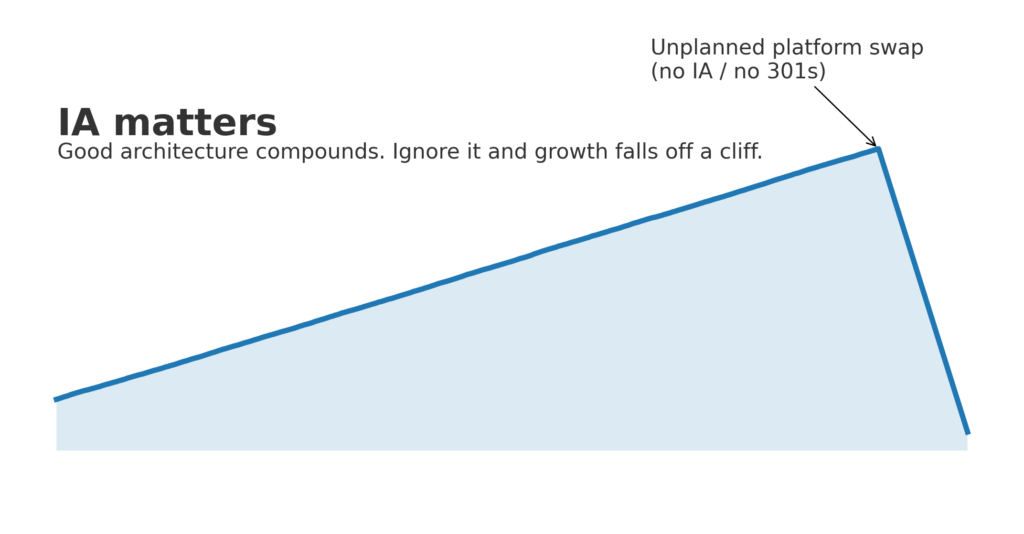 TL;DR: IA (Information Architecture) is how your site’s content is organized—categories, URLs, menus, and internal links—so humans can find things and search engines understand them. Get IA right and rankings, crawl efficiency, and conversions go up. Get it wrong (say, by switching platforms without redirects or content parity) and traffic falls off a cliff.